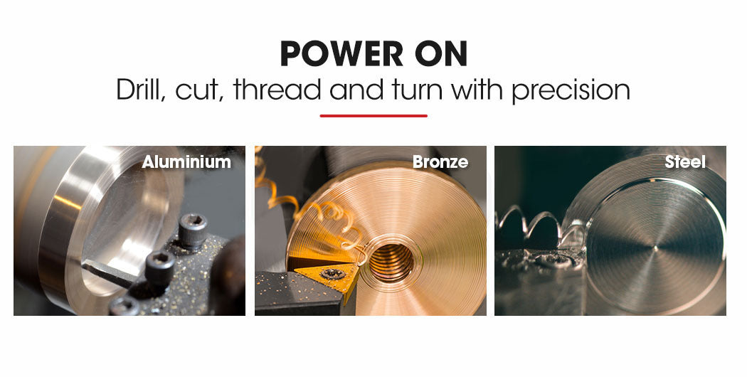 The Baumr-AG 7' x 14' lathe is a sturdy, heavy-duty unit with its cast-iron bed and componentry. With high and low gear and infinitely variable speeds right up to 3000rpm, this mini metal lathe makes short work of drilling, cutting, threading and turning. It will also operate at all speeds in reverse, which makes left-hand threading an option. With 600W of power on tap and adjustable powerfeed, you'll be making small parts, threaded parts, fittings and dies from brass, bronze, aluminium and steel with ease.