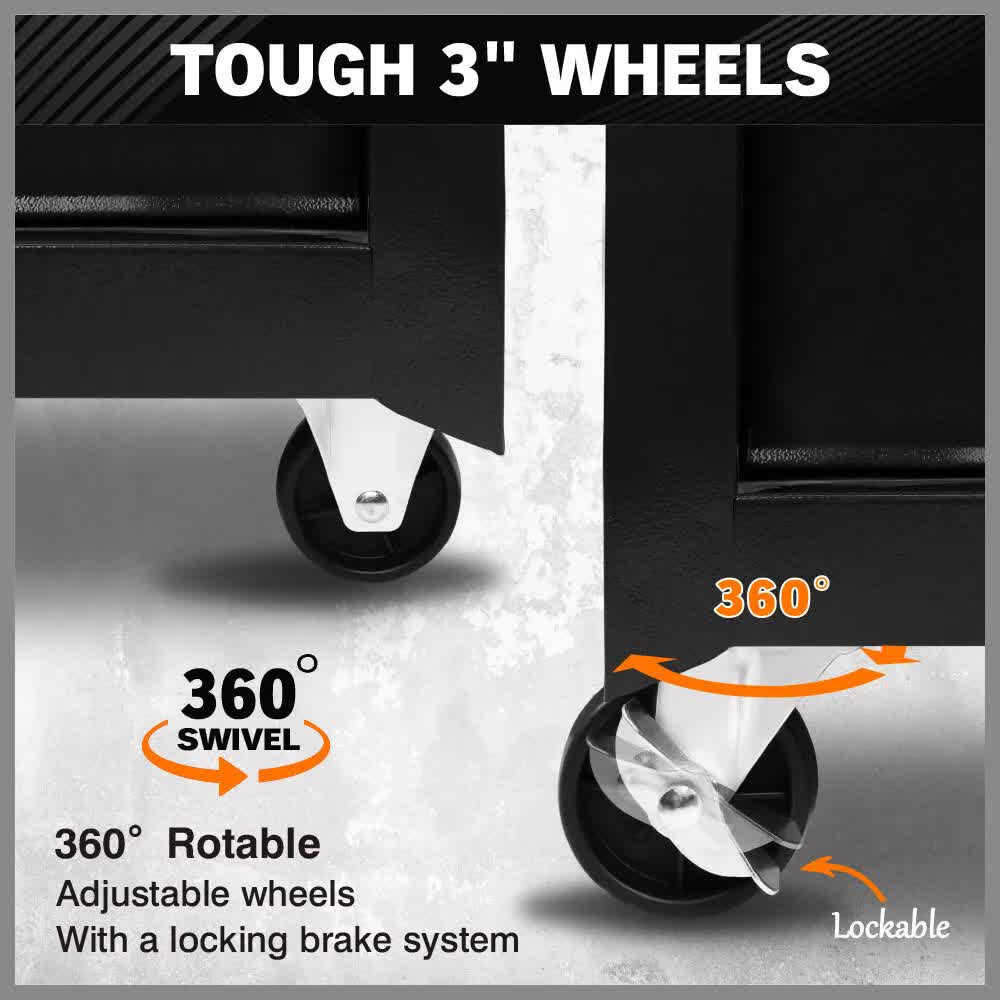 From top to bottom, each drawer slides in and out easily, with ball bearings coupled to metal drawer rollers. Each drawer is lined to protect your tools and prevent them from moving.