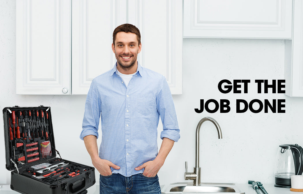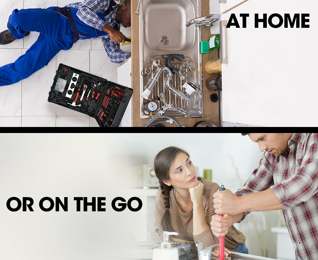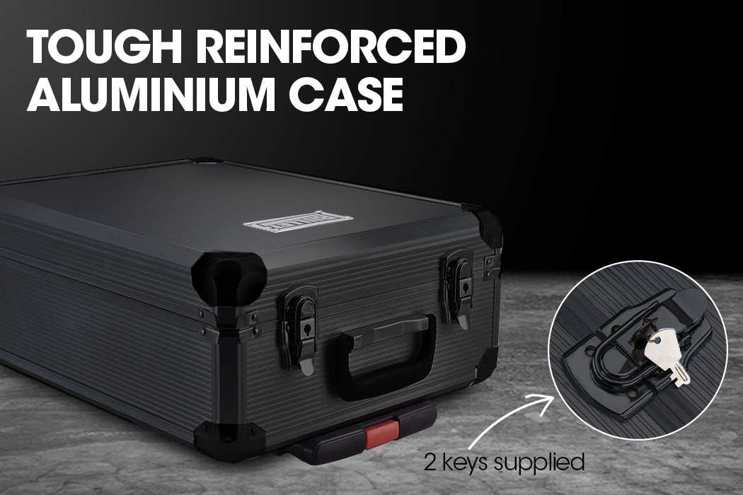 The tools are fitted in four secure removable blow moulded inserts layered within the case. Both its carry handle and telescopic handle coupled with the roller wheels allow for effortless transporting. Dual lock and key latches secure the case, with two keys included. This all-inclusive compact unit contains an incredible 925 pieces and fits discreetly in any room of the house.