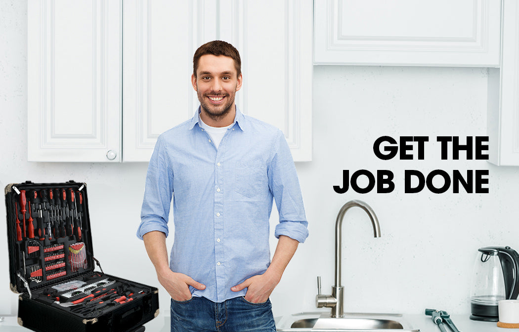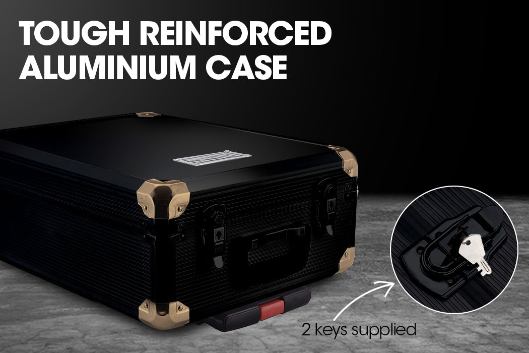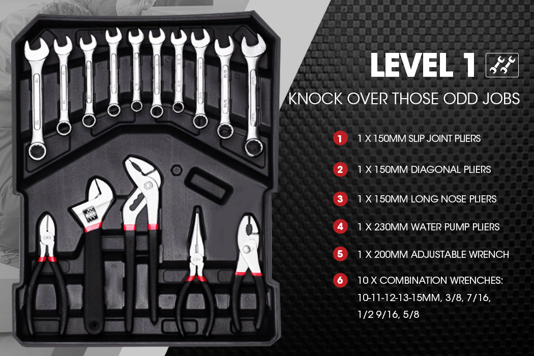 The tools are fitted in four secure removable blow moulded inserts layered within the case. Both its carry handle and telescopic handle coupled with the roller wheels allow for effortless transporting. Dual lock and key latches secure the case, with two keys included. This all-inclusive compact unit contains an incredible 925 pieces and fits discreetly in any room of the house.