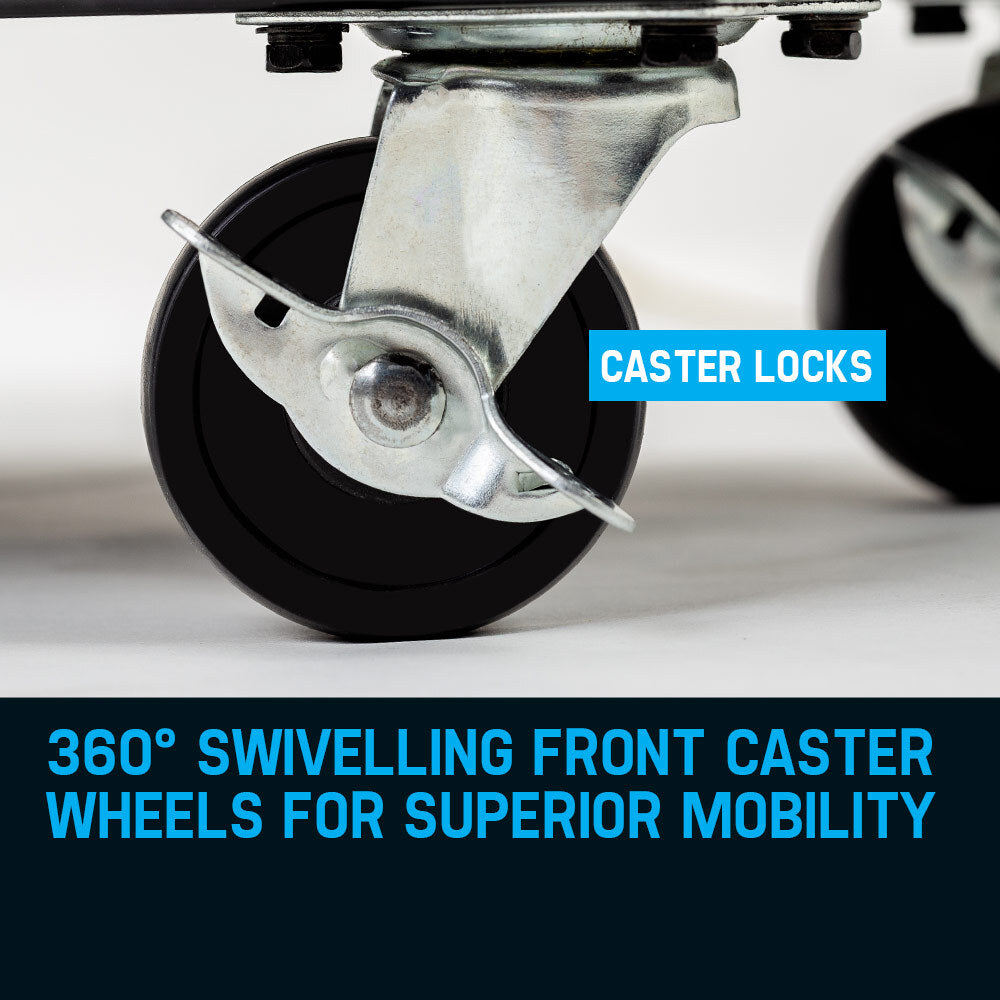 In search of the perfect weld, you should forget all worries behind and steady your hand. The Rossi Deluxe makes sure you can. With plenty of space for the welding unit, wires, rods, mask, tungsten nozzles and everything else that's required for a successful fusion, you can focus entirely on the work at hand. And you can work quickly too thanks to its solid-rubber rear wheels and nimble 360° swivelling front wheels with brake, your Rossi Deluxe is a breeze to move around the workshop.